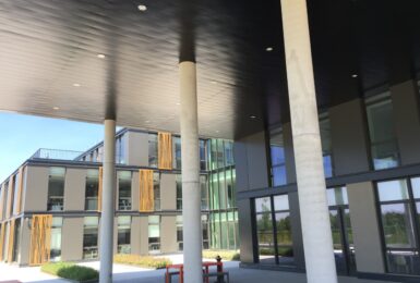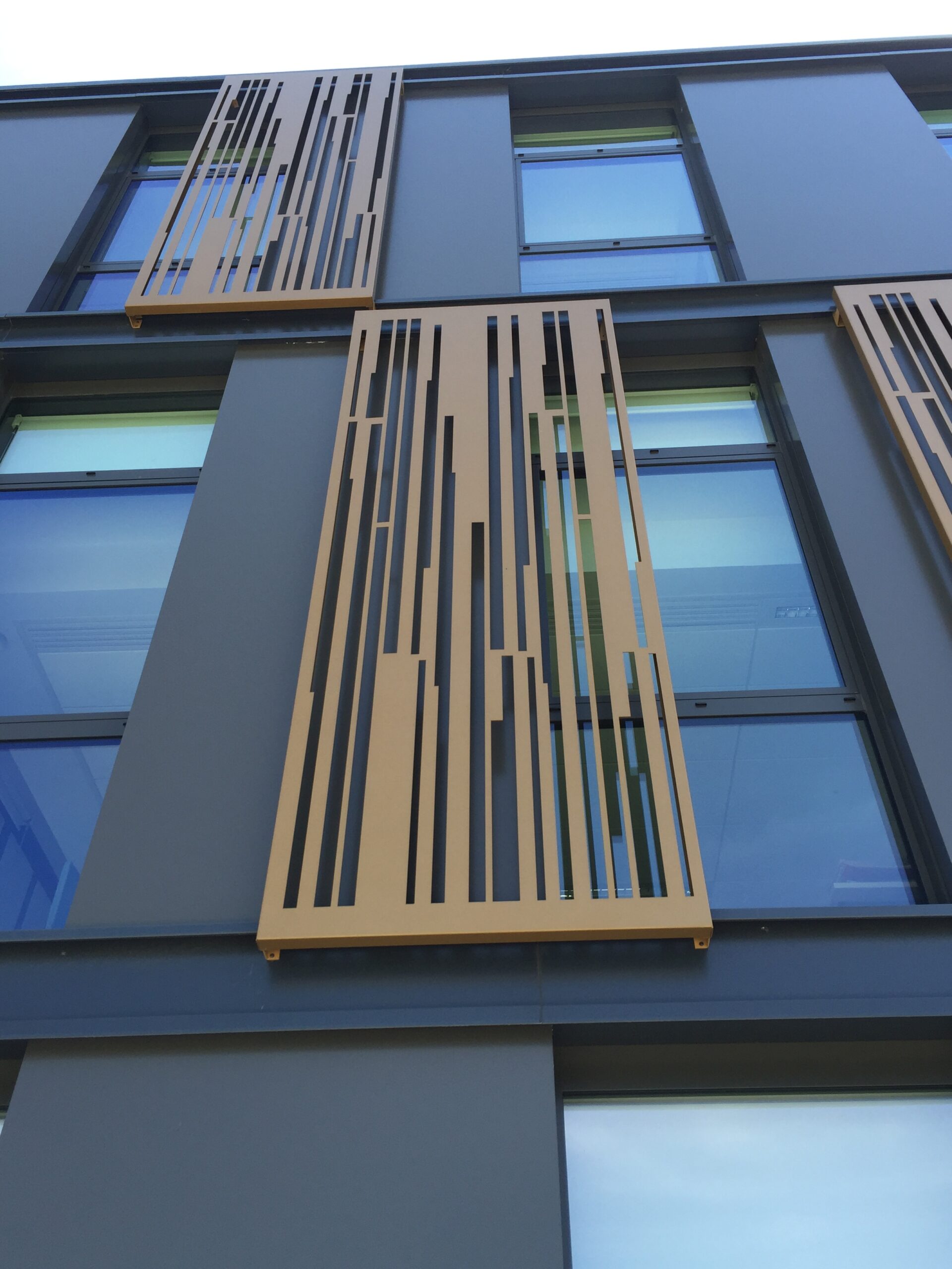 composites – Occultations en métal découpé – Plafond extérieur à clins métalliques – Métallerie