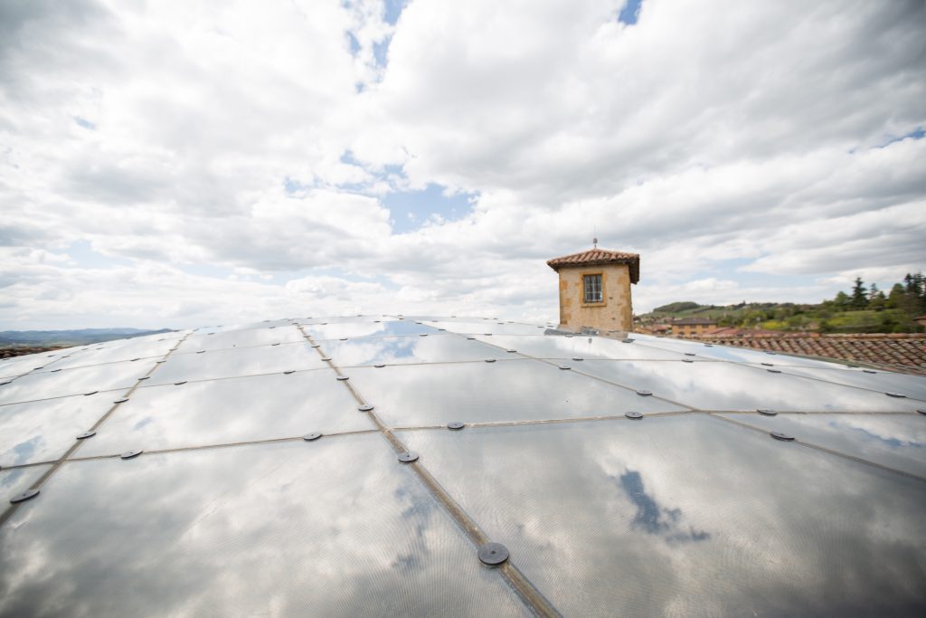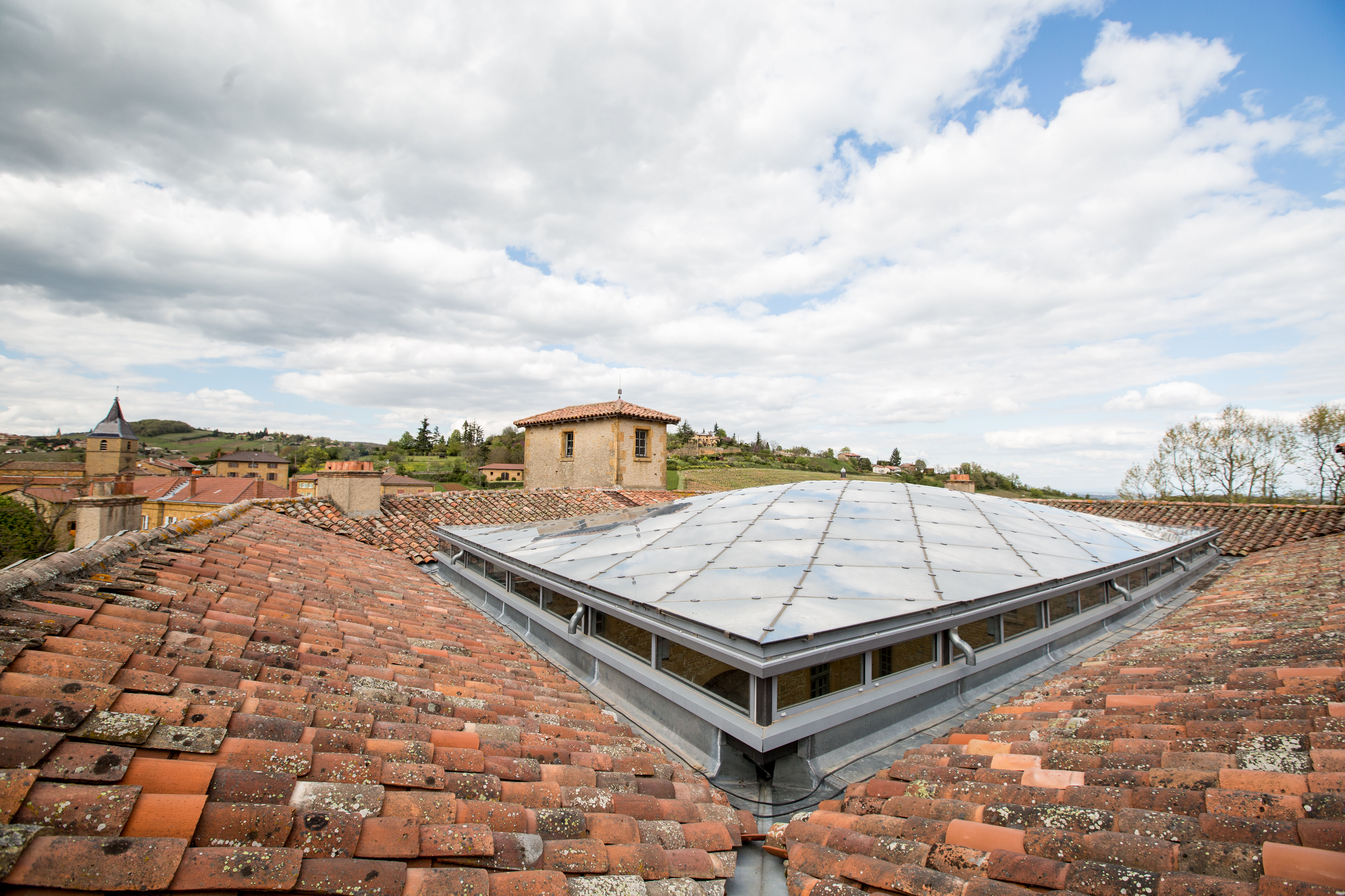 « Cette verrière aux résilles renflées contemple huit siècles d’histoire ! Nous avons assemblé les différentes parties de sa structure métallique sur place, et effectué un plan de repérage identifiant chaque vitrage aux dimensions uniques. Du sur-mesure pour un mariage réussi ! »