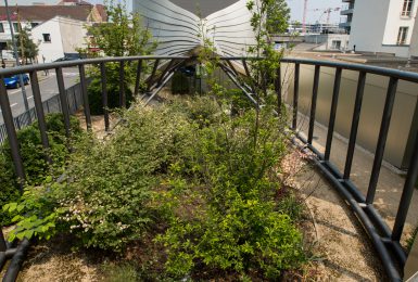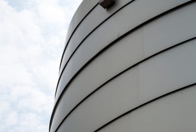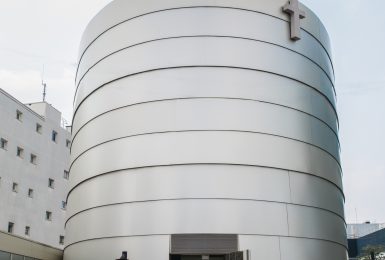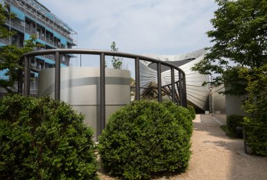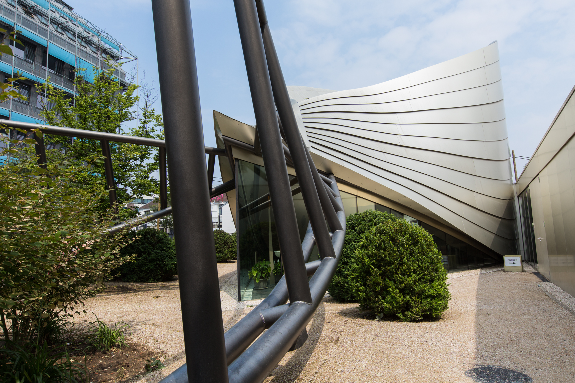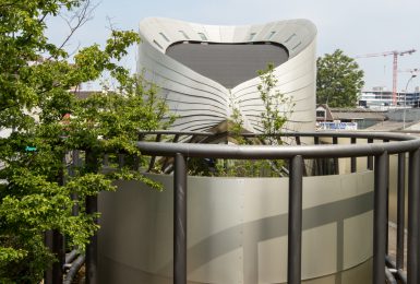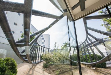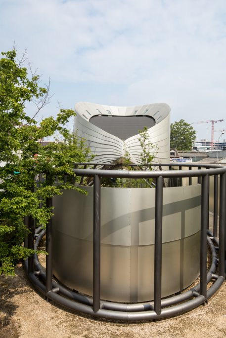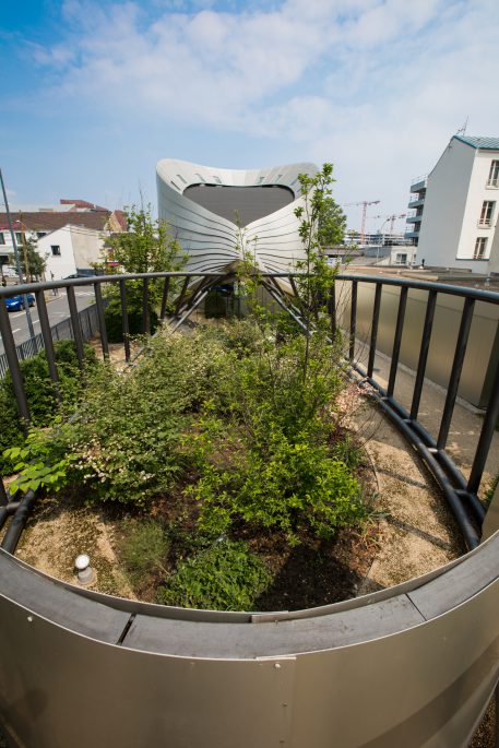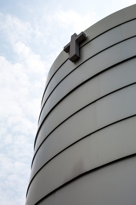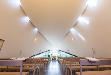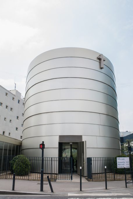 Construction du clos couvert de la maison d’Eglise. Chapelle de 200 places associée à un espace de rencontres et à un lieu d’exposition qui invite au recueillement. La nef prend ainsi la forme d’une « goutte » et s’ouvre sur un jardin, reflétant calme et sérénité. La forme du plafond rappelle celle de la quille d’un navire. La lumière y joue un rôle central. Douze baies zénithales rectangulaires sont réparties tout autour de la voûte de l’église, diffusant une lumière naturelle.