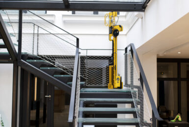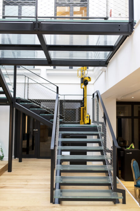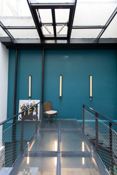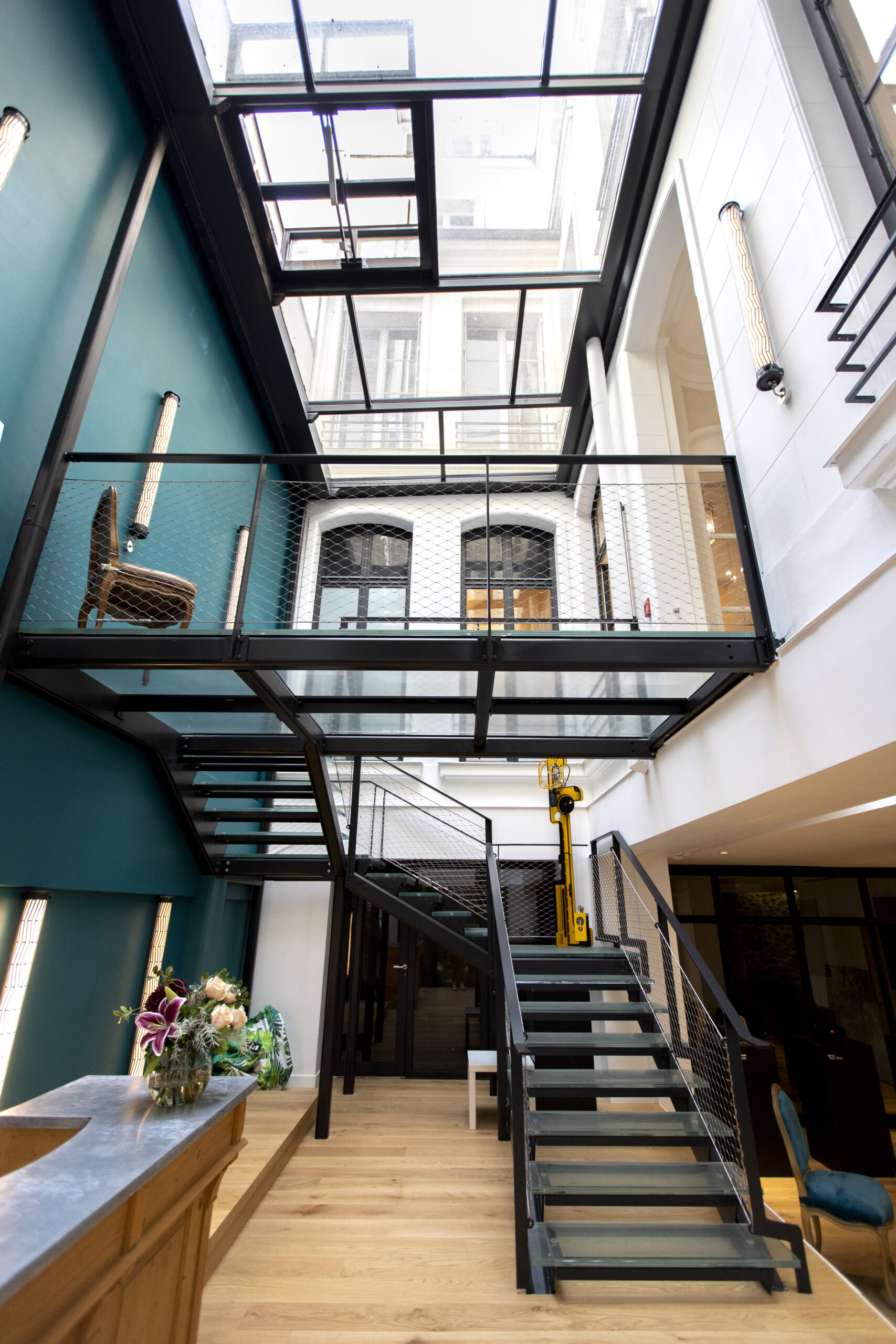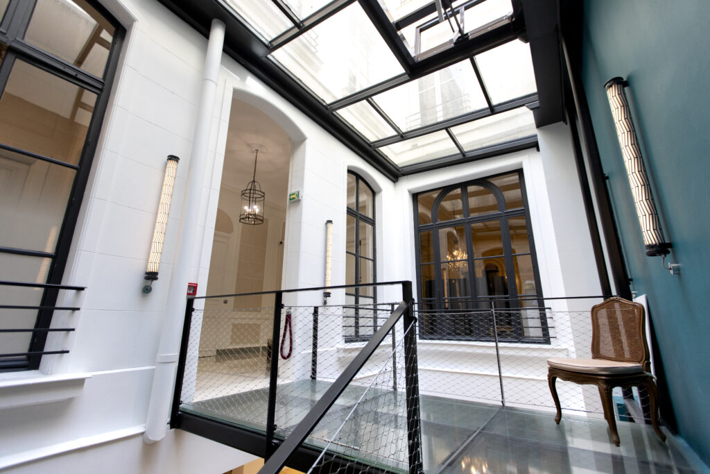 Unifab, Union des Fabricants, à l’origine des travaux, a choisi de rénover certaines pièces du musée et de fermer la cour intérieure par une verrière à ossature métallique, créant ainsi un atrium central. Astucieux !