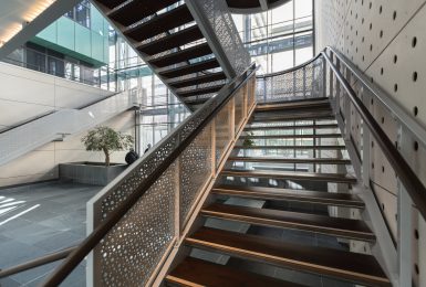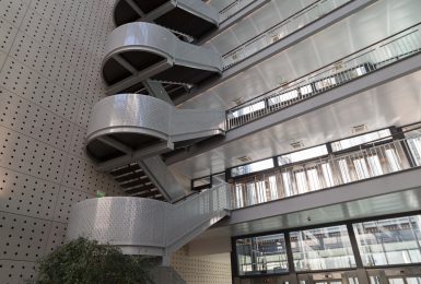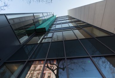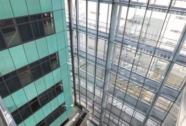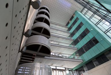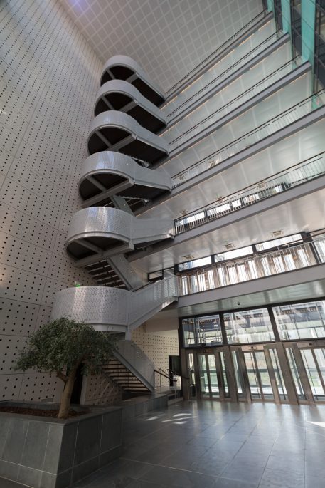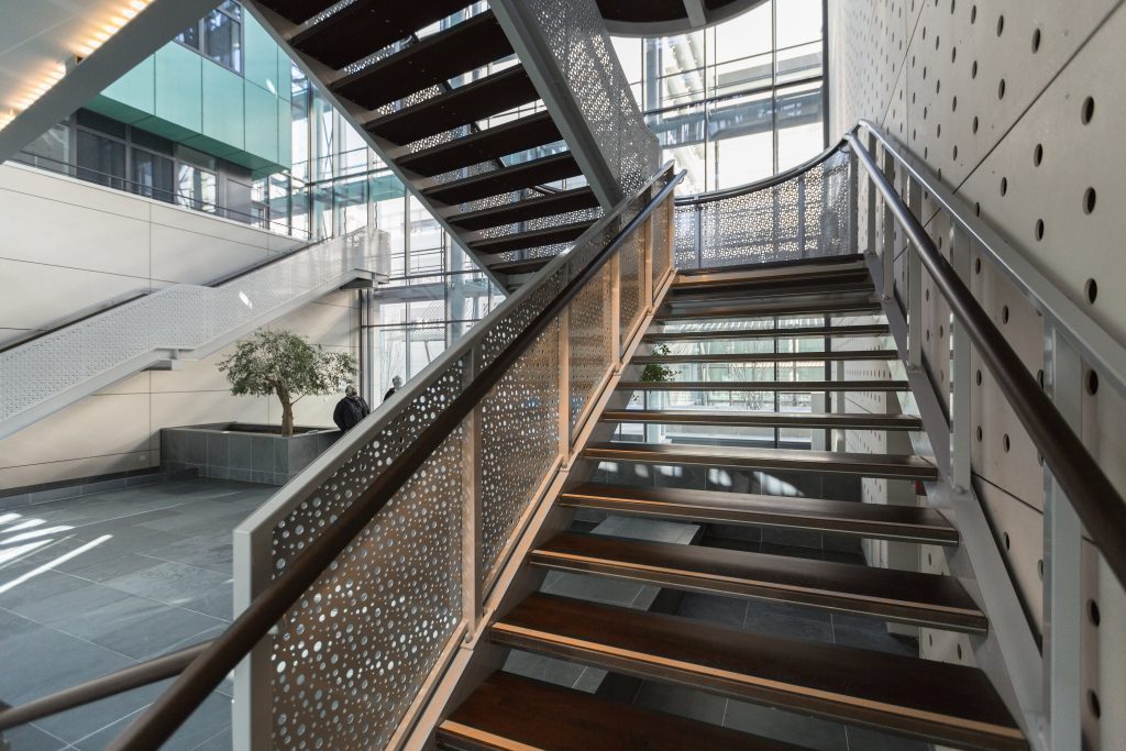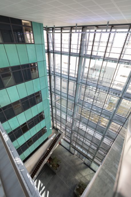 « À peine six mois de délai pour la mise en œuvre et la pose d’une structure métallique extérieure qui vient supporter toute une façade vitrée. Nous sommes intervenus sur : la structure métallique, les façades intérieures et extérieures, les passerelles, la cage d’ascenseur de l’atrium et des escaliers. Le résultat est surprenant ! ».